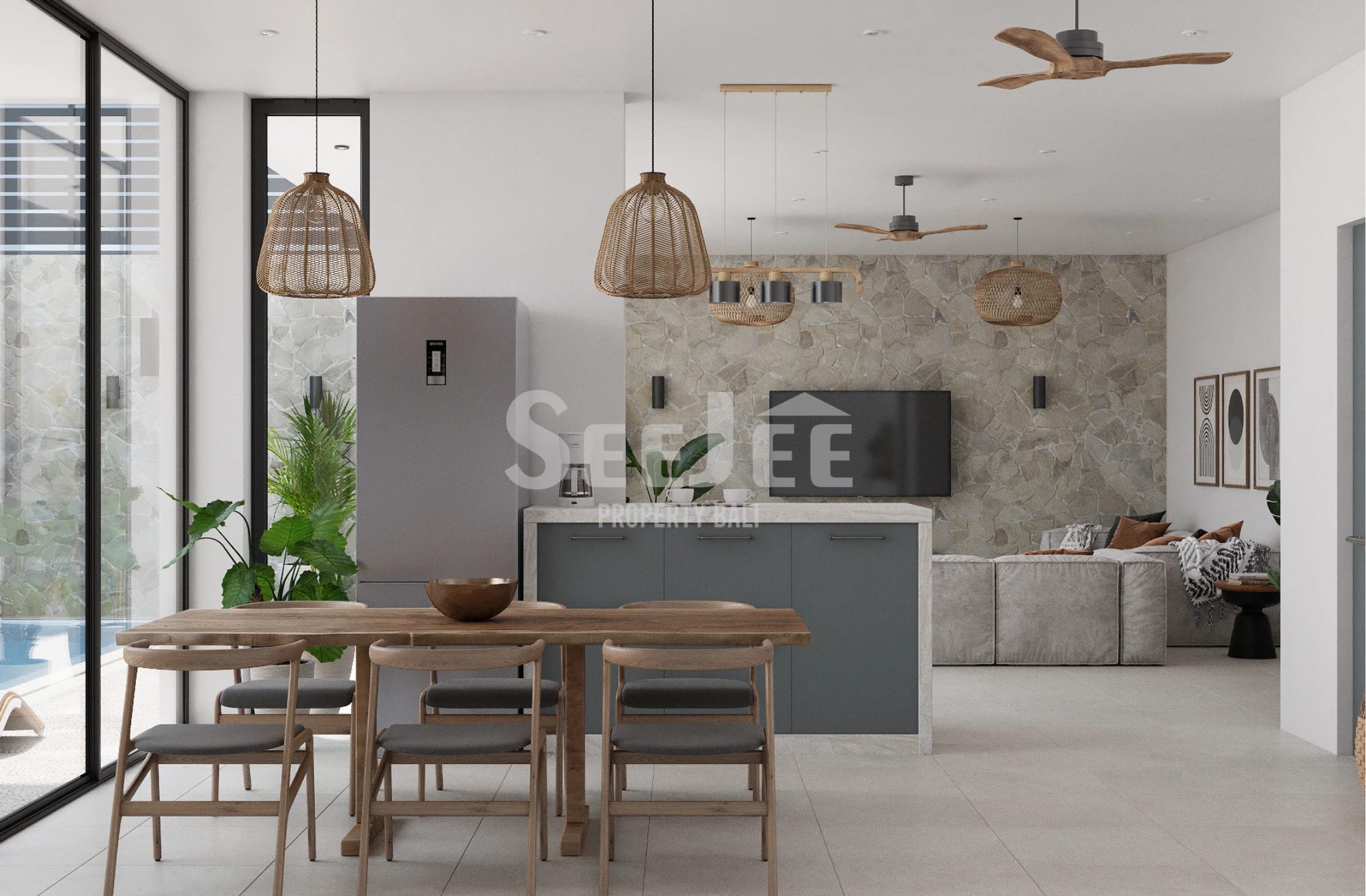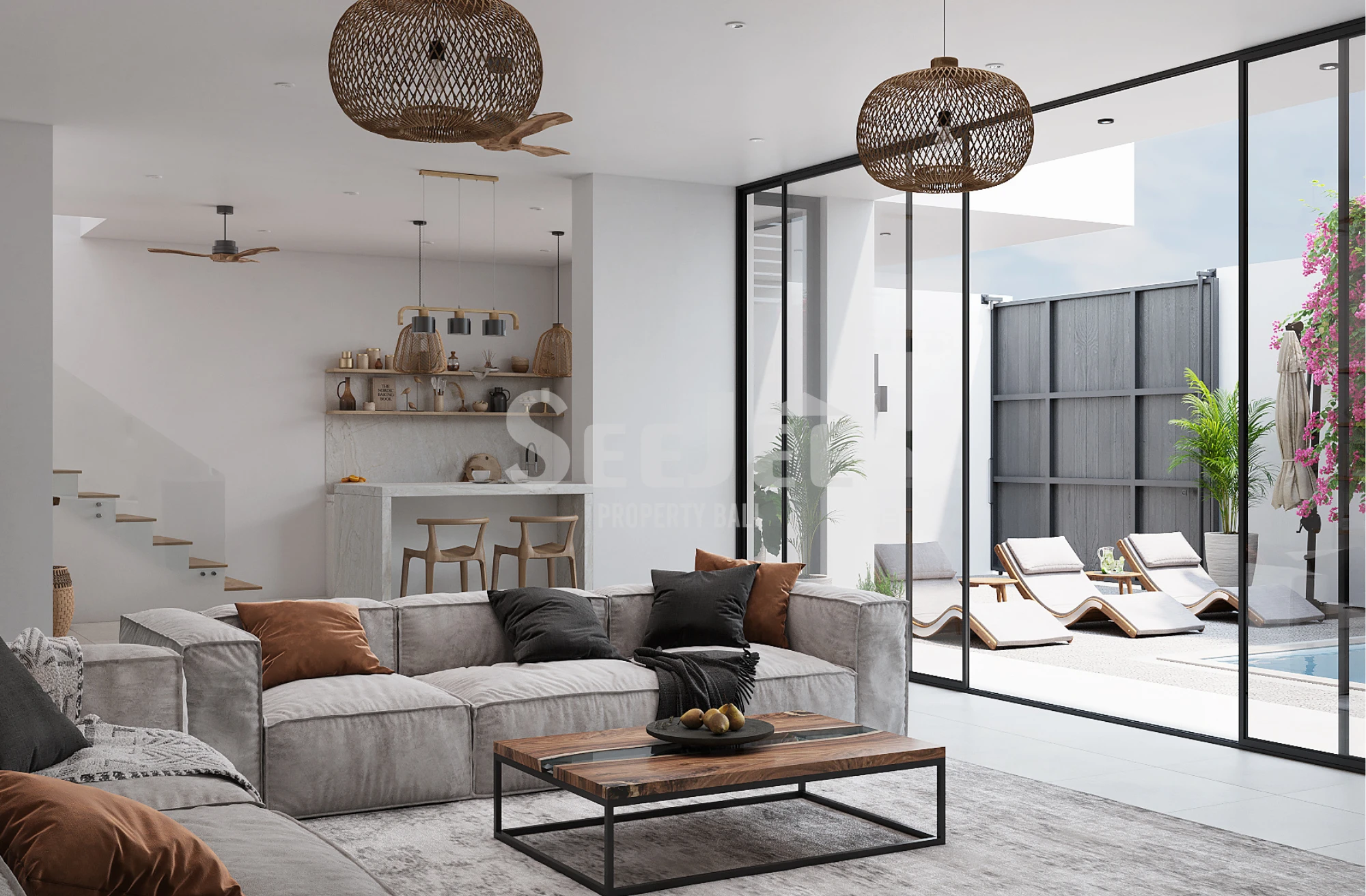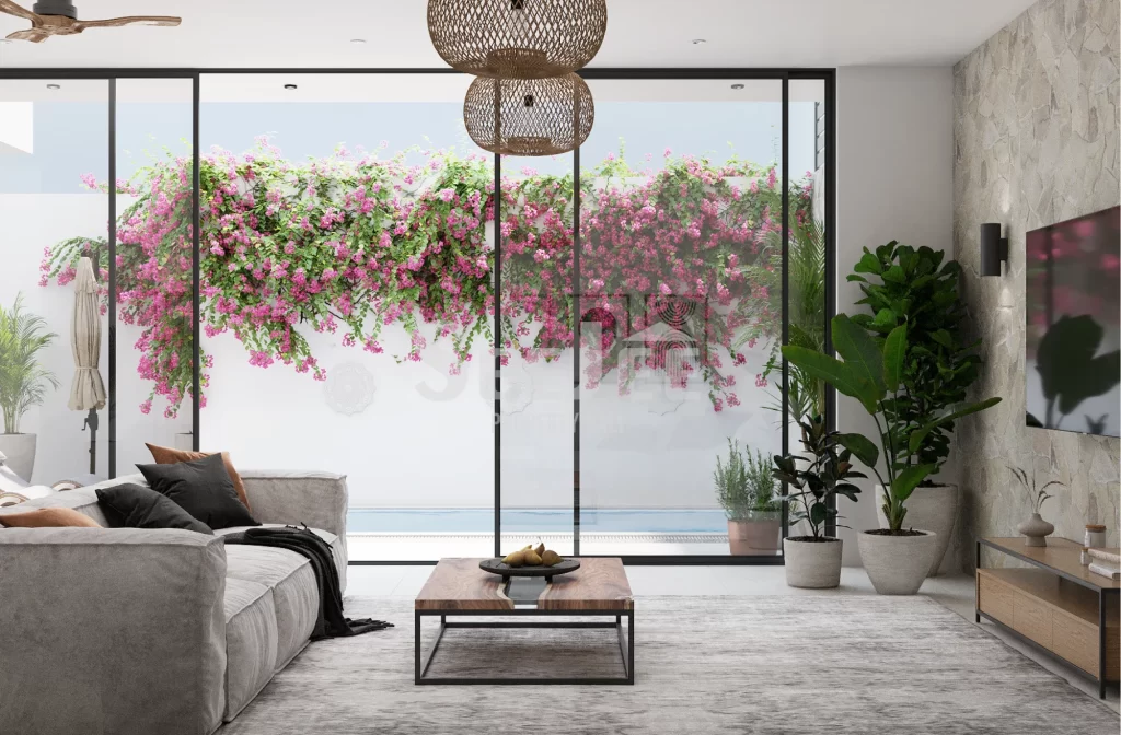 Step inside and the atmosphere immediately shifts—light pours through expansive glass panels, blurring the boundary between indoors and outdoors. The living space feels open yet intimate, where soft textures, warm wood accents, and curated details invite slow mornings and effortless evenings. From the lounge, your view drifts naturally toward the private pool, a tranquil centerpiece designed for both relaxation and connection.
