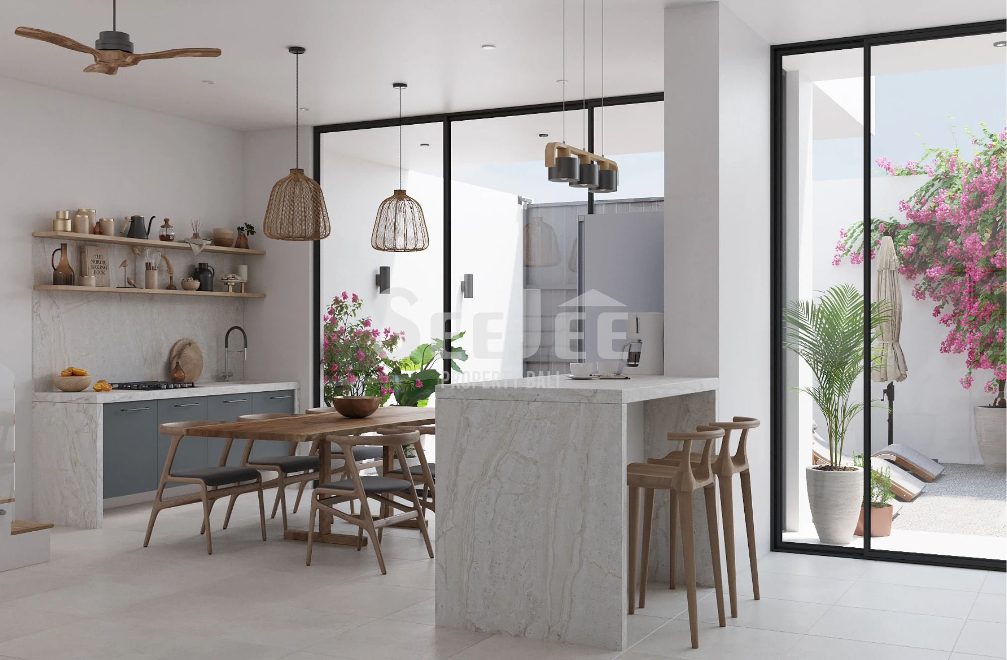Tucked quietly within one of Bali’s most sought-after coastal enclaves, this villa unfolds as a serene escape where modern design meets tropical softness. Clean architectural lines and calming neutral tones create a sense of quiet sophistication, while touches of greenery and cascading bougainvillea soften every edge, making the home feel both refined and alive.