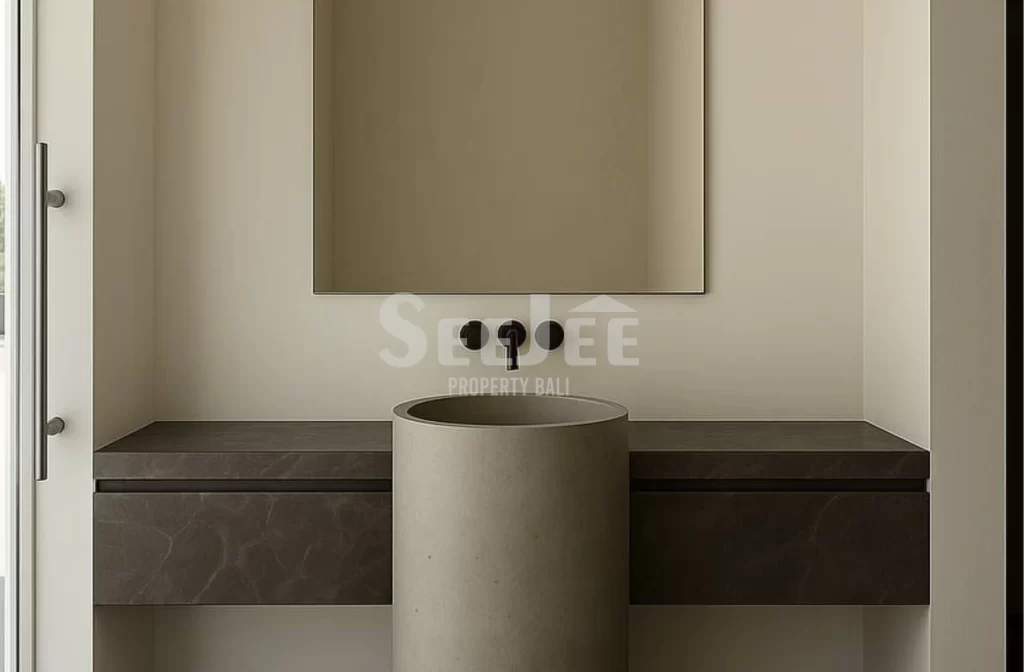 Upstairs, the bedrooms become peaceful retreats—minimal, airy, and gently lit. Every corner feels intentionally quiet, a place where rest comes naturally. The bathrooms echo the same understated elegance, with earthy tones and sculptural elements that transform everyday routines into something more indulgent and calming.